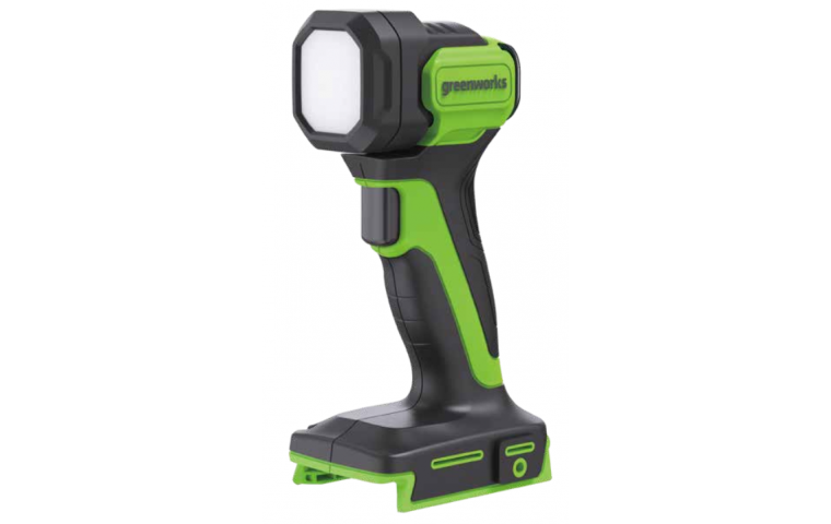 Аккумуляторный светодиодный фонарь Greenworks G24LS200 из серии 24В со световым потоком 200 люмен для применения при плохом свете. Имеет 3 режима яркости, поворотную головку на 90 ° вверх, ременную клипсу, а так же скобу для подвеса.