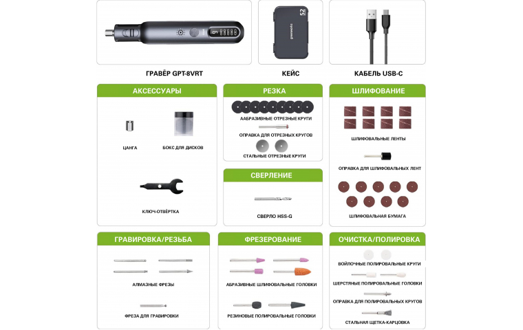 Гравер Greenworks GPT-8VRT – это компактный инструмент для выполнения различных задач, включая резку, полировку, шлифовку, заточку, сверление и гравировку.