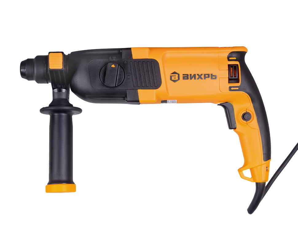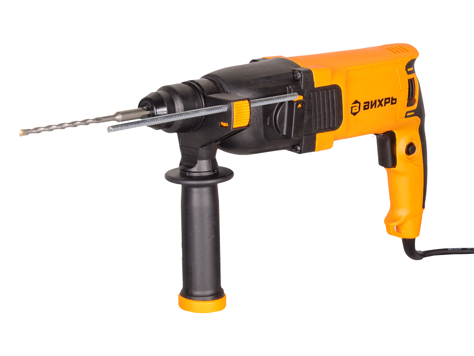 Перфоратор ВИХРЬ — электроинструмент, аналогичный дрели, но с наличием не механического, а пневматического ударного механизма. Именно поэтому перфоратор используют для сложных работ по твёрдым материалам — бетону, кирпичу, металлам. Агрегат используется для сверления и пробивания отверстий в прочных материалах без приложения особых физических усилий со стороны оператора. Принцип работы перфоратора – это разрушение обрабатываемого материала с помощью поступательных и вращательных действий рабочего элемента. Состоит перфоратор из электрического двигателя, редуктора, ударного механизма и патрона для крепления рабочих инструментов (буры, коронки, зубила и т.д.).