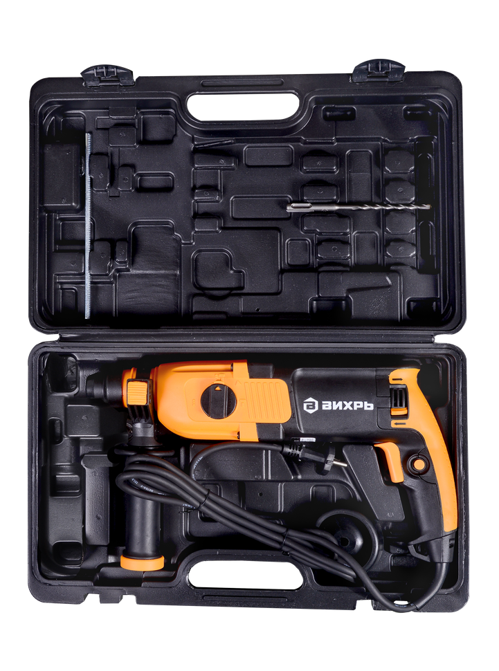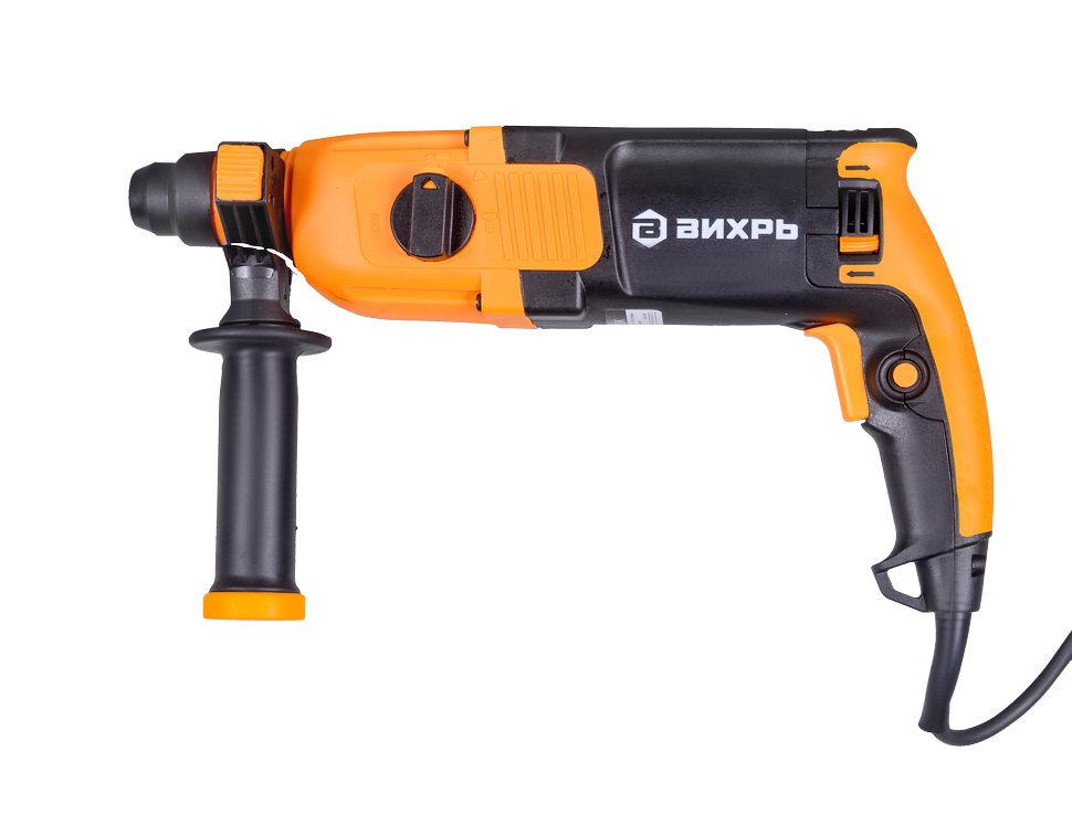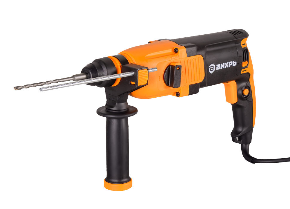 Перфоратор ВИХРЬ – электроинструмент, аналогичный дрели, но с наличием не механического, а пневматического ударного механизма. Именно поэтому перфоратор используют для сложных работ по твёрдым материалам - бетону, кирпичу, металлам. Агрегат используется для сверления и пробивания отверстий в прочных материалах без приложения особых физических усилий со стороны оператора. Принцип работы перфоратора – это разрушение обрабатываемого материала с помощью поступательных и вращательных действий рабочего элемента. Состоит перфоратор из электрического двигателя, редуктора, ударного механизма и патрона для крепления рабочих инструментов (буры, коронки, зубила и т.д.).